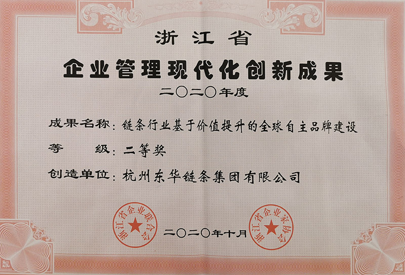 日前,公司申報(bào)的“鏈條行業(yè)基于價(jià)值提升的全球自主品牌建設(shè)”項(xiàng)目分別榮獲浙江省和杭州市2020年度企業(yè)管理現(xiàn)代化創(chuàng)新成果二等獎(jiǎng)稱號(hào),這是企業(yè)連續(xù)多年在企業(yè)管理創(chuàng)新成果中獲獎(jiǎng)。
