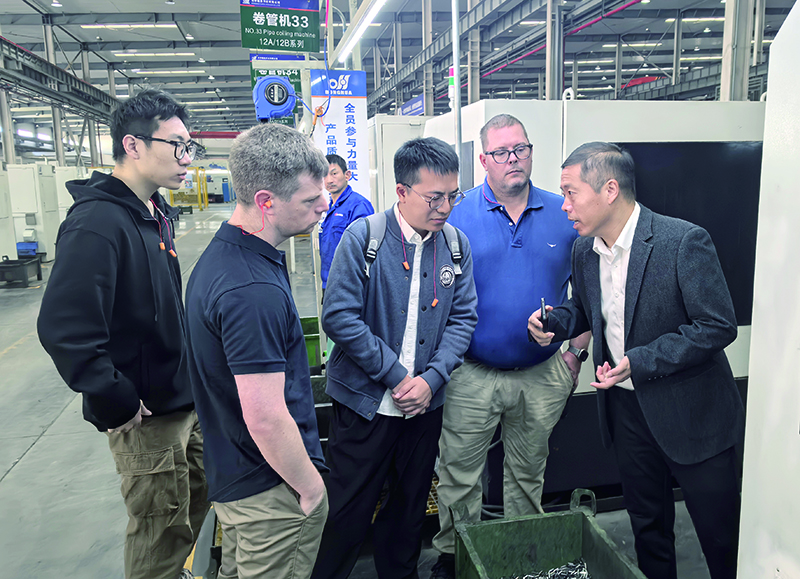 客戶首站參觀了生產(chǎn)車間,依次考察了原材料檢驗、工序加工、數(shù)控加工、熱處理、表面處理、裝配及包裝上油等全流程。車間整潔的環(huán)境、先進的數(shù)智化設(shè)備以及員工專注的專業(yè)態(tài)度,獲得了客戶的充分肯定。雙方在參觀過程中不時駐足,就具體工藝細節(jié)展開現(xiàn)場探討。嚴謹?shù)牟僮髁鞒膛c精細的質(zhì)量管控體系,進一步向客戶展現(xiàn)了興化公司對產(chǎn)品品質(zhì)的極致追求。