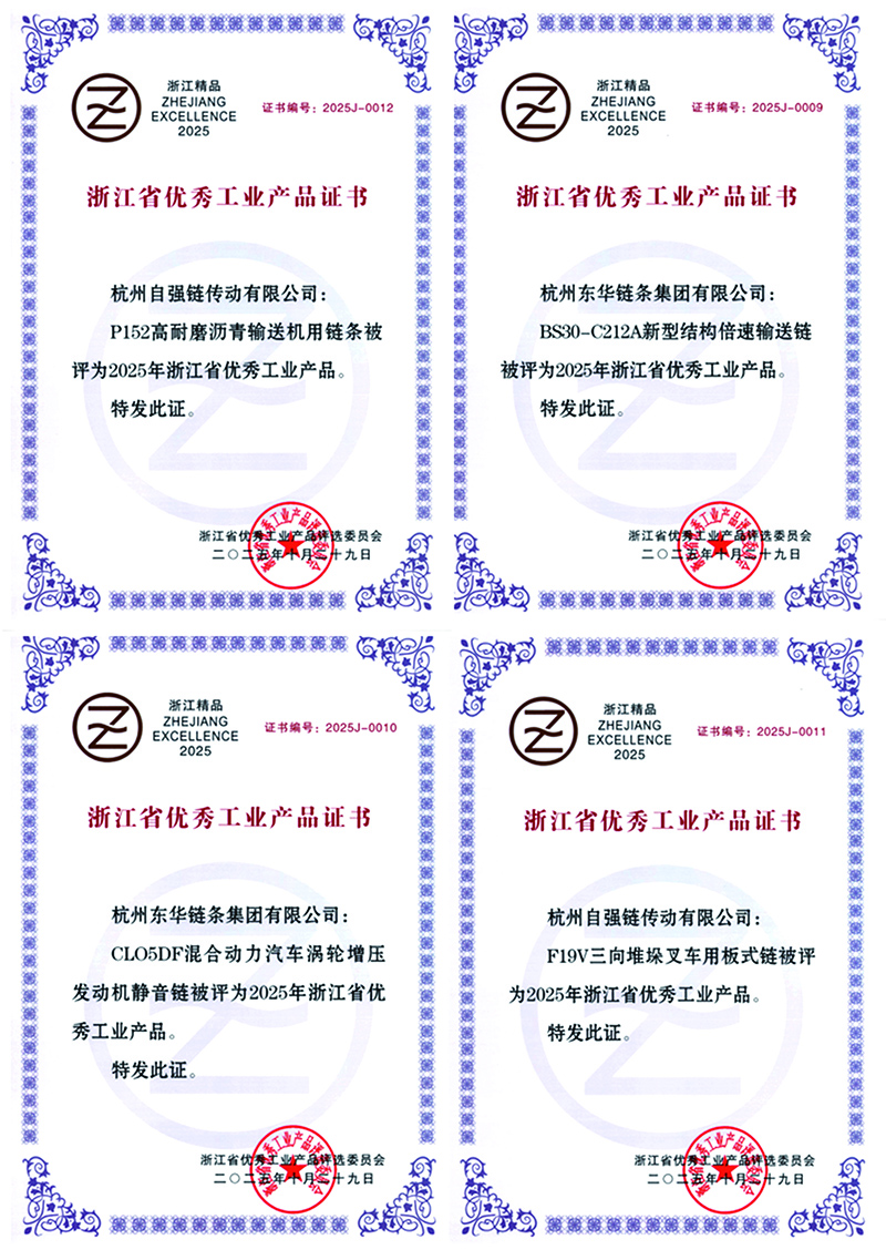 日前,浙江省工業經濟聯合會會同全省65家省級行業協會及各市“三會”,組織開展了“2025年浙江省優秀工業產品”評選活動。經過嚴格的初選、專家審議、公示與決選等程序,“2025年浙江省優秀工業產品”名單正式發布。東華鏈條集團申報的四項高端產品榮獲“2025年浙江省優秀工業產品”稱號。