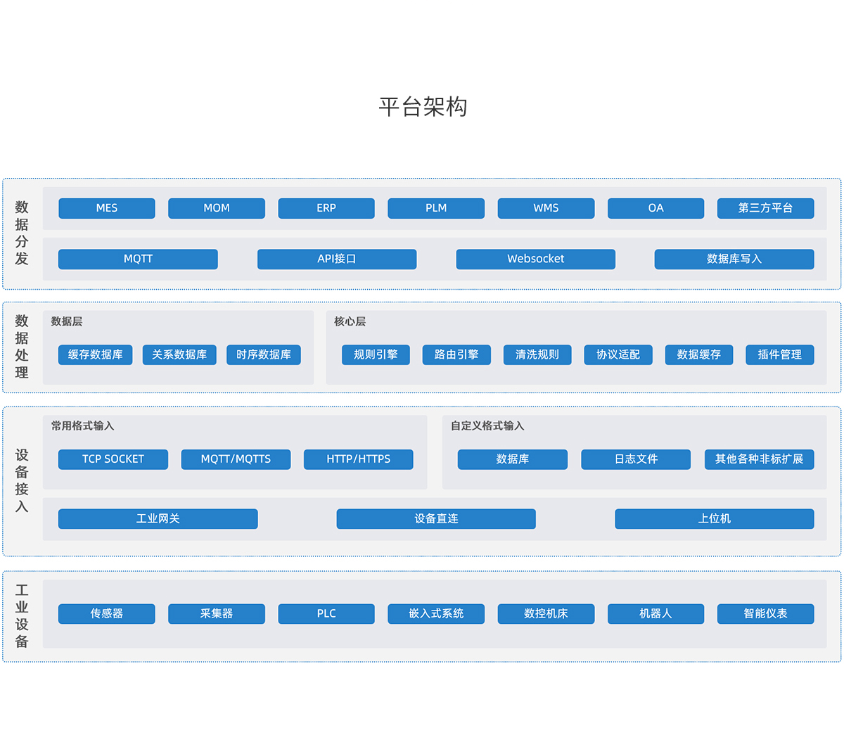 可支持PLC、傳感器、DCS、上位機(jī)、數(shù)控機(jī)床、智能儀表、智能機(jī)器人等多種類型的網(wǎng)絡(luò)傳輸協(xié)議的設(shè)備數(shù)據(jù)采集,也可為各類MES、MOM、ERP、PLM、WMS、OA系統(tǒng)提供數(shù)據(jù)分發(fā)
